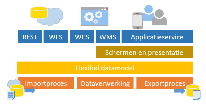 GeolinQ is a web-based no code software platform to collect, process and apply spatial data. Data from different data sources are integrated into tailor-made information products by the flexible data model. All source data and information products are disclosed to users and applications via services. Data-driven applications such as managing datasets, conducting inspections and publishing information products and source data in portals are configured by application screens in a application service.